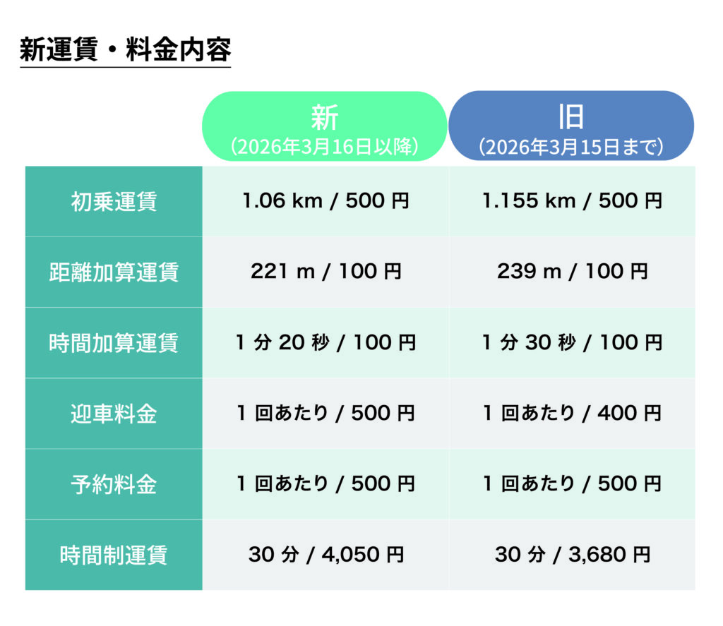 2026年3月16日より、お客様の利便性、サービス向上のための改善、また、乗務員の労働条件改善のため、運賃・料金の改定を致します。