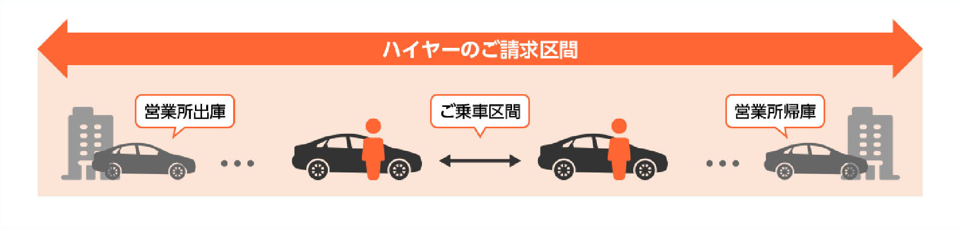 タクシーはお客様がご乗車されている区間のみがご請求対象となりますが、ハイヤーはお迎え(出庫)から車庫に戻る(帰庫)までの全ての区間がご請求対象となります。